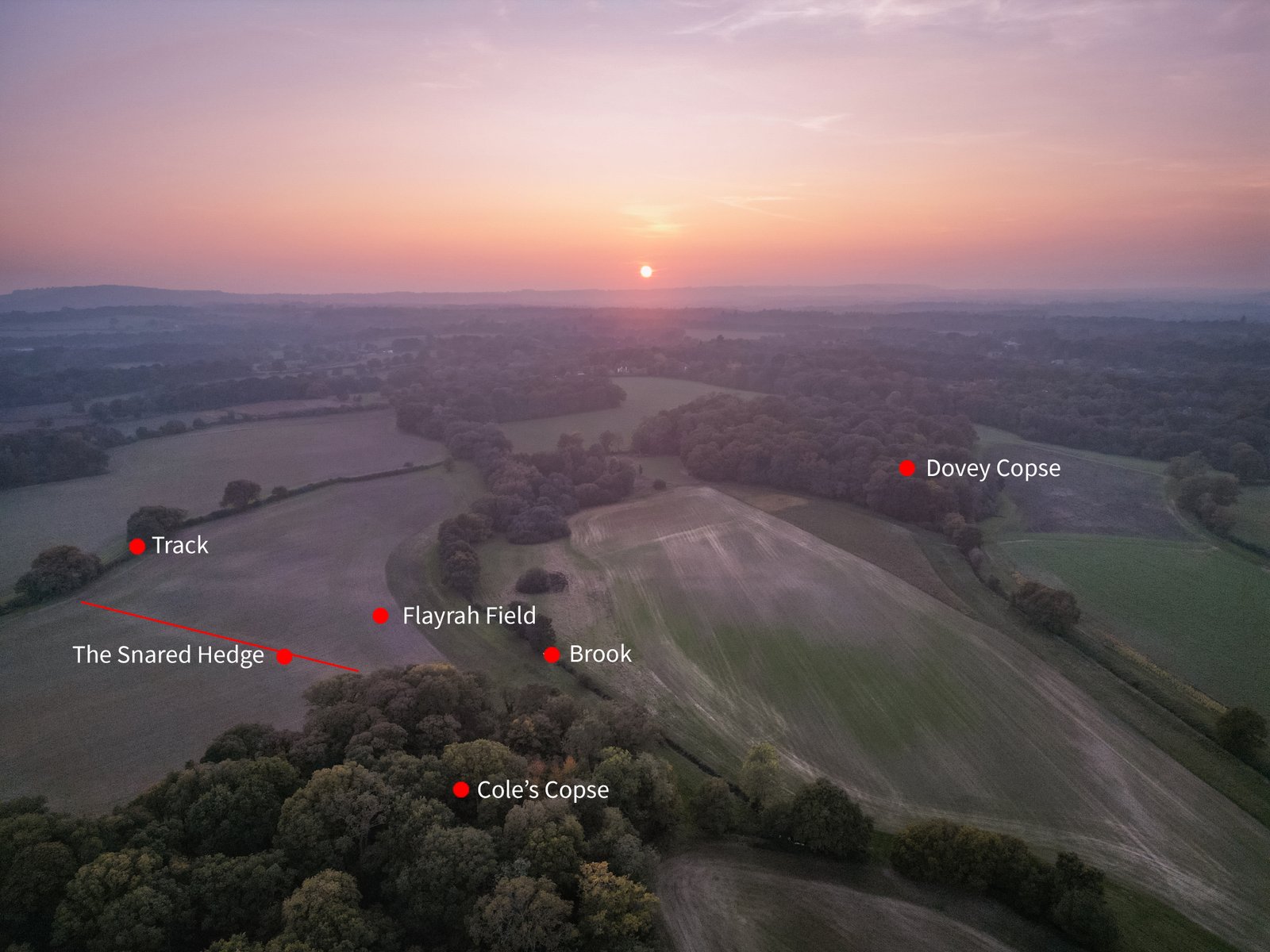 Annotated view of the landscape (featuring the Flayrah area and hedge) from above Cole’s Copse. October 2025.