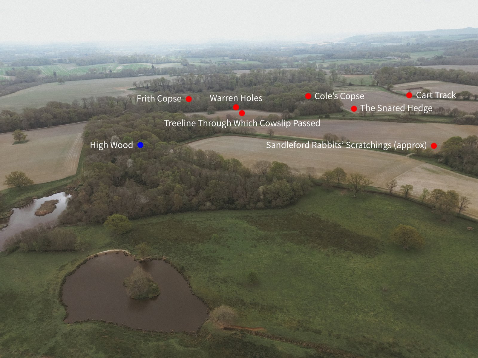 Annotated view, from the west, of the area around Cowslip’s Warren.